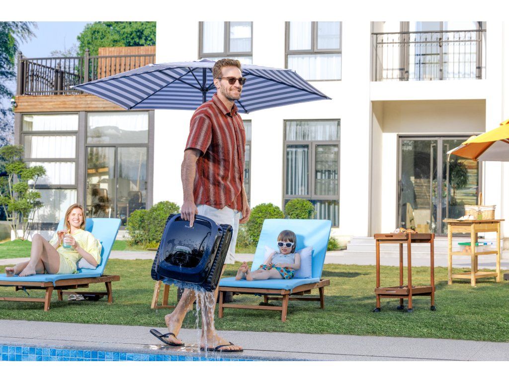 Luxusní plně automatický bezdrátový bazénový robot, který vyčistí dno, stěny i vodní linku a po dokončení se sám vynoří a zaparkuje k okraji bazénu. Ovládání přes aplikaci (Wi-Fi + Bluetooth), inteligentní senzory, filtrační koš 2 l a až 4 hodiny provozu.