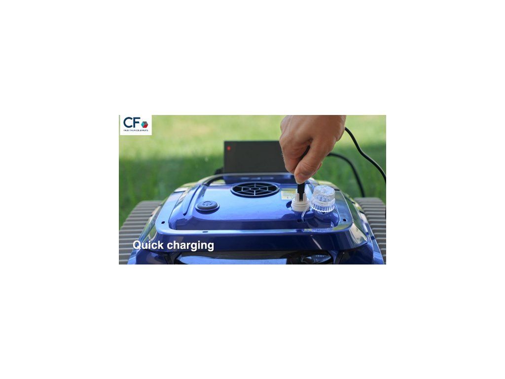 2. Výkonný motor a Li-Ion baterie s perfektní výdrží - Silná Li-Ion baterie a precizně řízený výkon tří motorů zajišťují maximálně efektivní čištění celého bazénu. Na jedno nabití vydrží CF 400 AKU pracovat až 200 minut, což je dostatečné pro dokonalé vyčištění bazénů do 120 m² (plocha stěn a dna). Baterie je navržena tak, aby optimálně rozdělovala energii mezi motory. Vysavač se tak pohybuje ideální rychlostí, drží si vysoký sací výkon a rovnoměrně pokryje celou plochu bazénu. Při správné péči (uložení při 40–50 % kapacity) zvládne až 1 200 nabíjecích cyklů, přičemž plné dobití trvá pouze 2,5 hodiny.