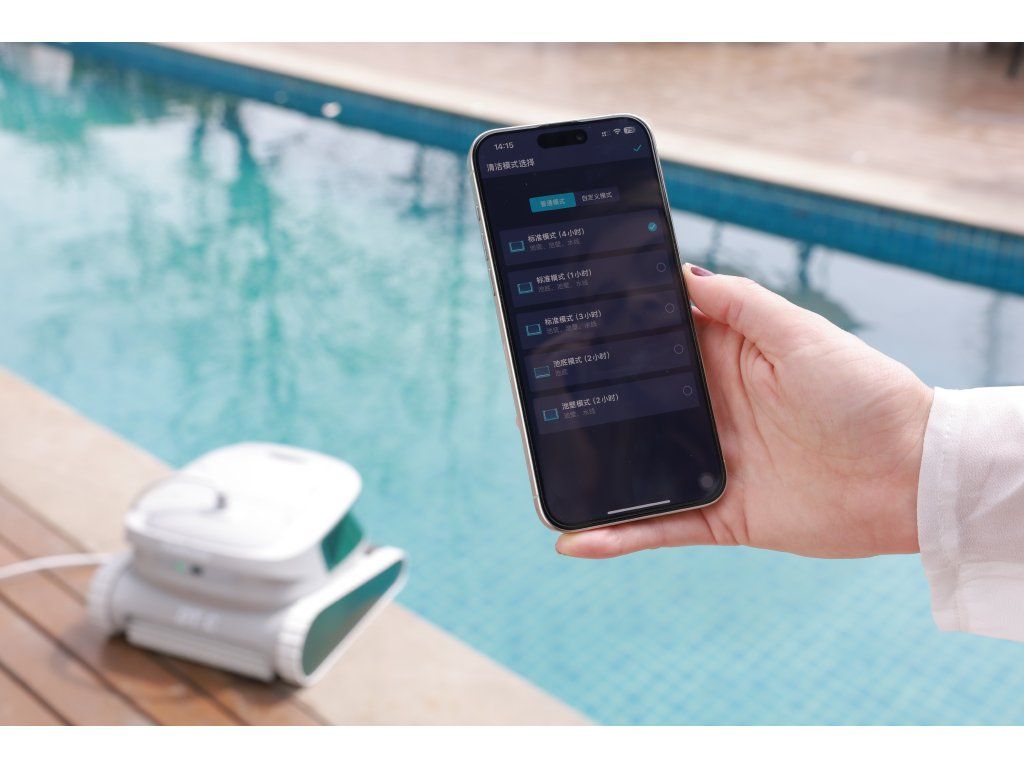 Poolmate DT C nabízí tři čisticí režimy – automatický režim pro kompletní čištění bazénu, režim pouze pro dno a režim pouze pro stěny. Ovládání je možné buď manuálním tlačítkem přímo na těle vysavače, nebo pohodlně prostřednictvím mobilní aplikace, kde lze navíc nastavit plánované čištění či odložený start.