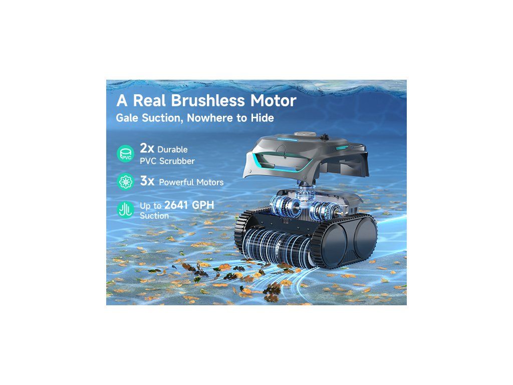 • Pro bazény do 150 m² • Výdrž 180 min • Li-Ion baterie 4 600 mAh • gyroskop • filtrace 180 μm + HEPA • Filtrační výkon 11,5 m³/h • 3 motory • Příkon 65 W • Rychlost cca 10 m/min • IPX8 • Vhodný pro slanou vodu (do 5 000 ppm)