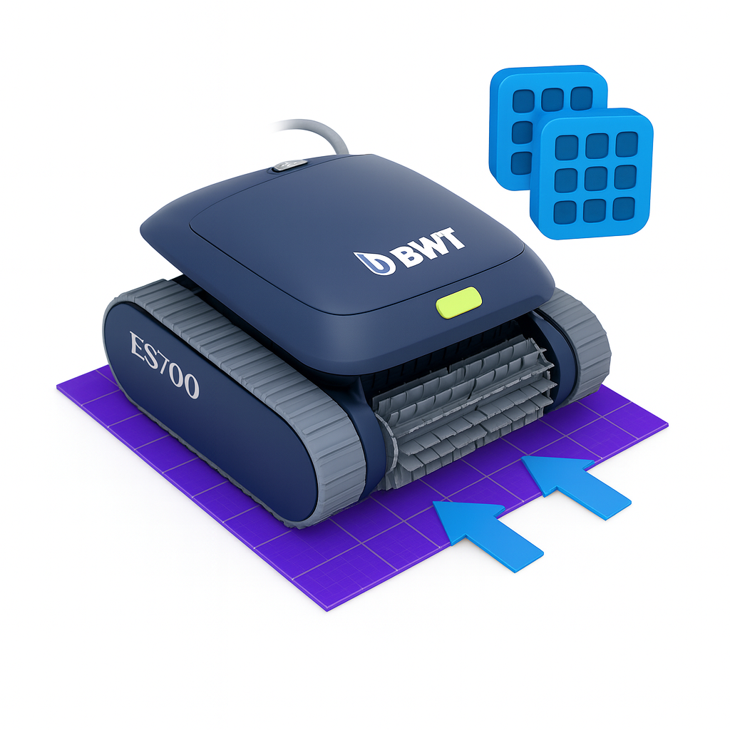 Robotický čistič BWT ES 700 přináší revoluci do údržby domácích bazénů. Díky nejmodernější technologii GENCORE7 kombinuje inteligentní navigaci, silný sací výkon a hyperjemnou 4D filtraci, aby byla vaše voda vždy dokonale čistá a bazén připravený k použití.