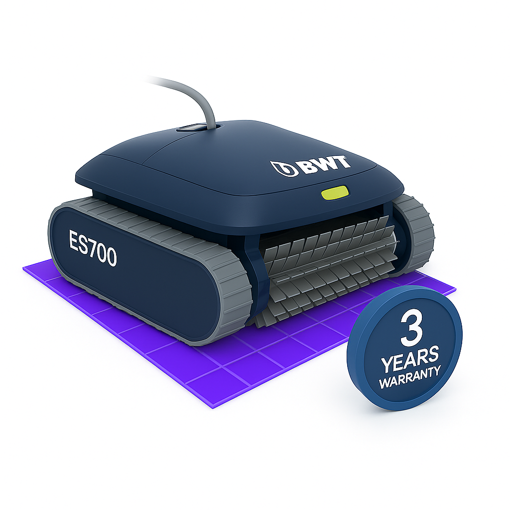 Pokud se rozhodnete pro bazénového robota BWT ES700, budete mít prospěch ze spolehlivého a účinného vybavení navrženého tak, aby zjednodušilo údržbu vašeho bazénu. Jeho technologie GENCORE7 zajišťuje čištění bez námahy s profesionálními výsledky. Díky ověřené kvalitě výrobku si dovolujeme poskytnout prodlouženou záruku 3 roky.