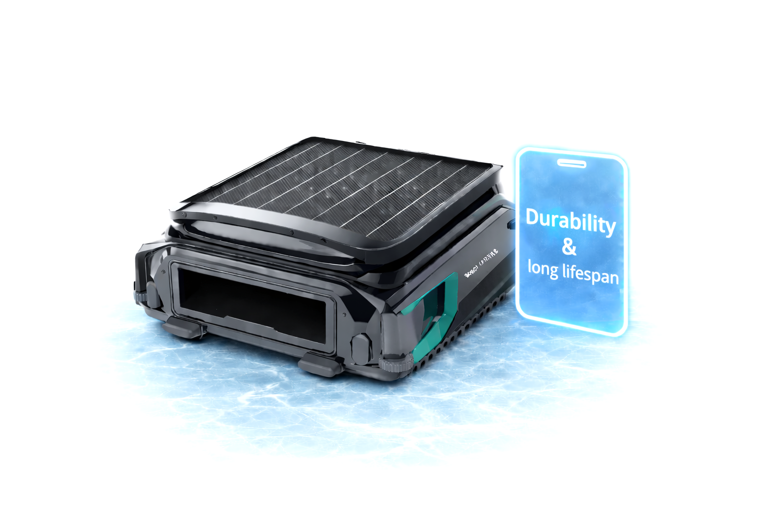 Nepřetržitý provoz až 8 hodin – ideální pro intenzivní čištění během dne. Robot využívá V-shaped navigační dráhu, která zajišťuje systematické pokrytí celé hladiny bazénu bez náhodného pohybu.