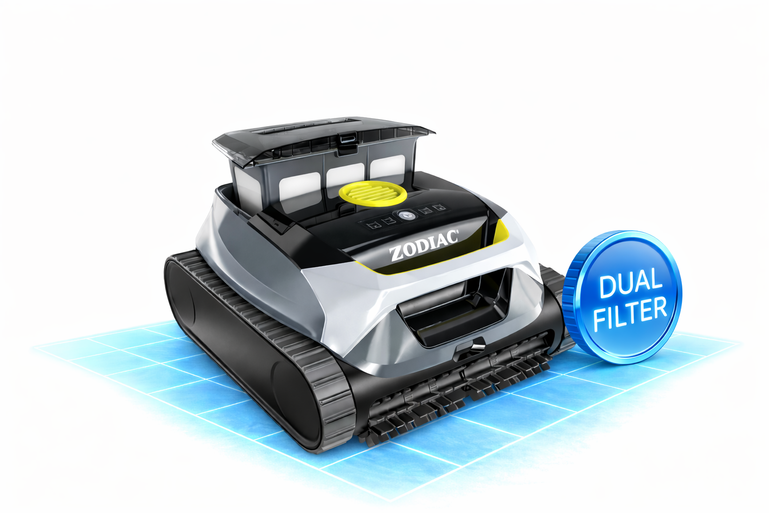 Robot disponuje dvoustupňovou filtrací – zachytí hrubé nečistoty i velmi jemné částice. Standardní filtrační koš sbírá nečistoty nad 180 mikronů a doplňková ultra jemná vložka zvládne částice až kolem 3 mikronů. Výsledkem je čistější voda bez zákalu. Velký rotační kartáč pomáhá uvolnit nečistoty ze dna i stěn.
